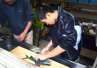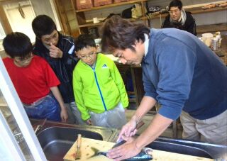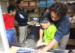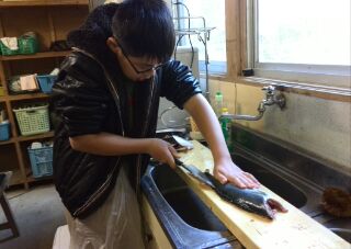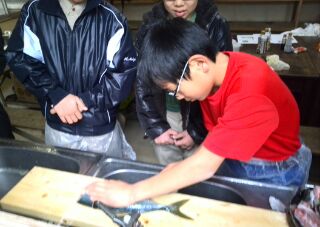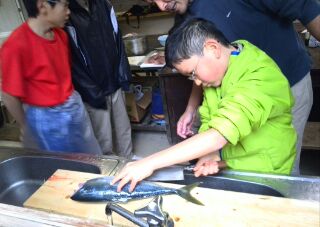 最初はおっかなびっくり、お魚隊長の鮮やかな捌き方に、スカウト諸君は釘づけ。