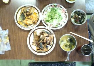 本日のメニューは、イナダの漬け丼、イナダのアラ汁、イナダの照焼き、イナダの玉ねぎサラダ、イナダのカマ焼き。