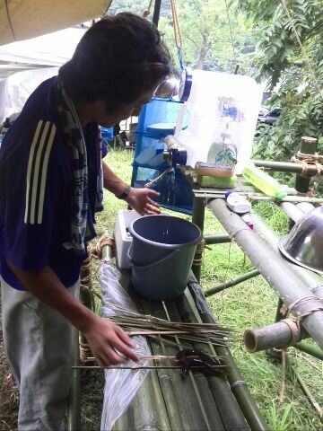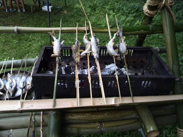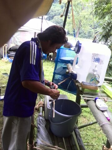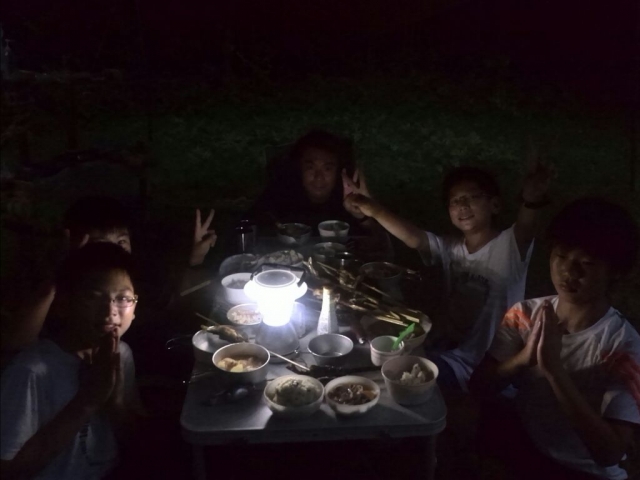 夏季野営の2日目(8月2日)今日は、那珂川を遊びつくすプロジェクトの第一弾「鮎料理に挑戦!」があるのだが、そのための炭焼用の立ちカマドを完成させなければならない。そそくさと朝食を済ませ、朝礼後、野外工作の続きとなりました...彼らの実力は、いかほどのものであろうか?!先に、調理台が怪しげなオブジェのように大地に立ちあがったが、触ると、今にも倒れそう...。お昼を挟んで、立ちカマドづくりに挑戦。竹と荒縄だけで作る工作がいかに難しいかを実感するスカウトたちであった。このままでは、今日一日も、野外活動だけになってしまいそう。那珂川の川遊びはどうなるのだ。スカウトたちは意外と川遊びを楽しみにしていたようだ。 仕方ないので、スカウト達が作った調理台を隊長が手を加え、荒縄を締め直し、何とかポリタンが設置できるようになり、また、排水もビニールシートを利用して集水できるようになりました。まあ、君たちも頑張った、これにめげずに、更にロープワークの技術を磨いてくれ。続いて、立ちカマドの作成を途中から並行して作成していたが、どうやら筋交いの入れ方が悪いようだ。(隊長:そりゃ傾くよなぁ~)これもまた、隊長が少しだけ手を加え、何とか火をおこす(BBQコンロの再利用)ことができました。恥ずかしいので、全景の写真は遠慮させていただきますおっと、鮎を仕入に行かなければ、そして、スカウトの気持ちを立て直すため、約束の地「那珂川の水浴」をして参りました。お前ら、そんなに楽しいか...というくらいはしゃいでました。動画でないのが残念スカウト達がはしゃいでいるうちに、隊長は生きた鮎を調達に行っていたのだといってもすぐ目の前だったけど。鮎は当然、養殖もの、仕方ないですね。鮎ともにスカウト達も野営地に戻ると、班長は帰らなければならないことに...、今年はお受験のため、夏休み中に希望校のオープンキャンパスに行かなければならないとのこと。そりゃ残念。鮎も食えなければ、夏季野営の最大イベントにも参加できないなんて、なんて可哀想な班長笹〇君。来年はVS隊だ。鮎を1kgほど購入してきたので、ここは、しっかり捌ける職人の出番がやってきました。我が隊の誇る料理人中〇副長。 ちなみに、この竹櫛は中〇副長の手作りスカウトたちは、この間に、入浴タイム。烏山城温泉まで隊長の車で移動、二日分の垢を落としてきました。スカウト達が帰ってくると、中〇副長は、すでに鮎塩焼きを作成してしまったではないか。美味そうである。 鮎料理のをもう一品。「鮎飯」を作りました。素焼きした鮎3匹を研いだ米の中に入れ、昆布ダシと醤油少々、隠し味に貴重なお酒を少々ですよ。炭火で炊くこと、数分間、美味しそうに炊き上がりました。あとは汁物で豚汁をスカウト達だけで作りました。鮎飯、アユの塩焼き、豚汁この時、鮎の甘露煮を作るには時間があまりにもないため、一人1匹お持ち帰り用の甘露煮を買いましたが、腹いっぱいになって、隊長は出すのを忘れていしまいました。解散時にお土産で配りましたね。久しぶりに、美味い飯が食えた。この日は、後片付け後、来年の年間予定をスカウト達で考えました。来年は、どんなことをやろうかな.........、あ、来年は23WJでしたね。さて、誰が参加できるかな。(隊長:今の実力では......)明日は、早起きして撤収が待っているぞ。早く寝ろよな。本日は、天気も良く、きれいな星空でした。明日は、この夏季野営の最大のプロジェクト。こうご期待。