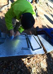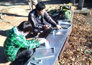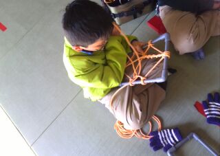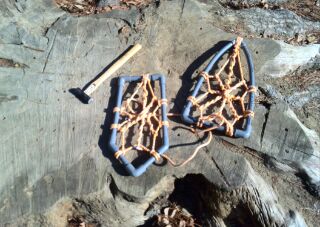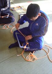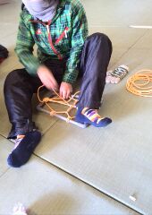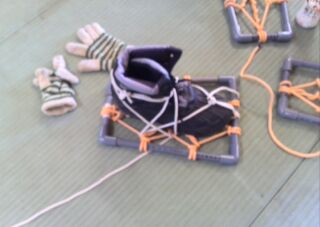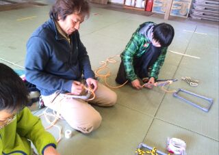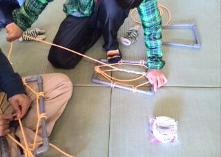 カンジキづくり。塩ビパイプと園芸用のひもで、2年前に一度トライしましたが、そのリベンジ!改良タイプを作成します。中〇副長が、コツコツと作成し、いろんな形を試してみました。
