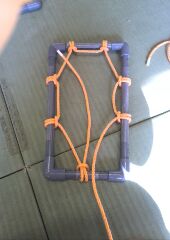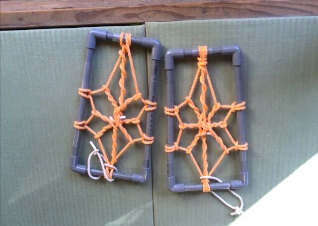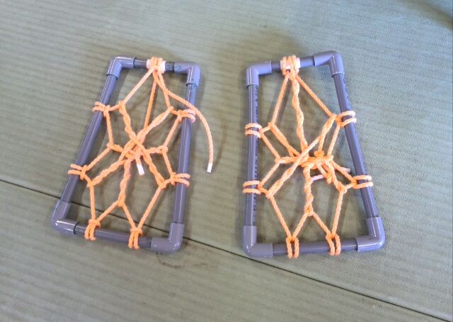 材料は、塩ビパイプ(13㎜)を2m、塩ビパイプの90°エルボを8個、ロープ(6㎜)を8m、塩ビ用の接着剤、組みひも(6㎜)を5m