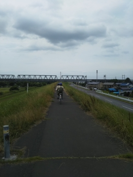 「栄橋」を通過。西側の土手を南下。途中、民家を脇を通り、河川敷内を走り、「鬼怒川大橋」へ。