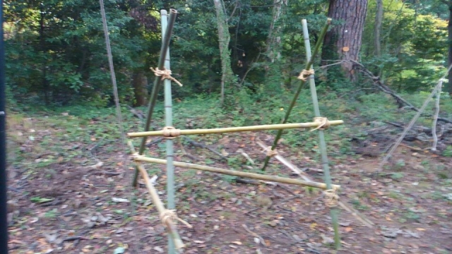先月、唐沢山の麓で切り出してきた竹と荒縄で野外工作だ。日頃のロープワークの練習の見せどころ?!