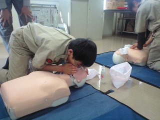 次に、救命処置で「心肺蘇生法」の実施。あの、上半身裸の人形を使うのです。意外と力が必要。