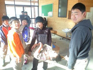 お昼を、栃本公園ですませ、そこで、先ほどの講義であった腕の骨折、足の骨折、急増担架の実施、少人数で人を運ぶ実演。
