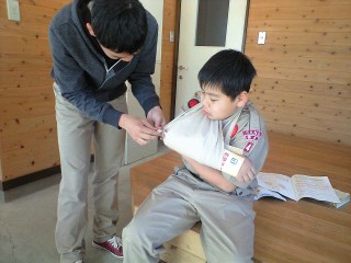 さらいに休憩後、「直接圧迫止血法」の説明、日常遭遇しやすい鼻血、熱中症、切り傷などの応急処置の説明、骨折・捻挫などに対しての身近な道具を使っての応急処置。 急造担架の実施。などなど