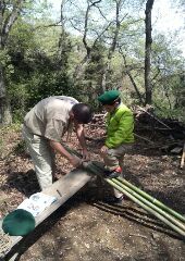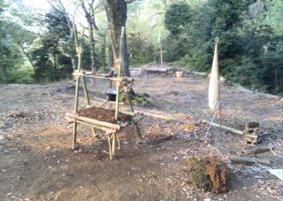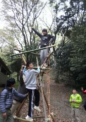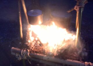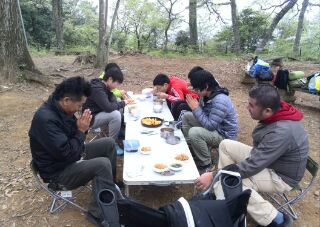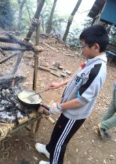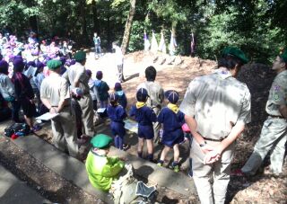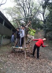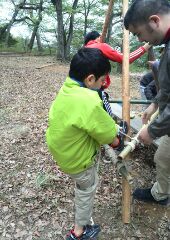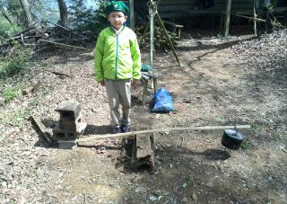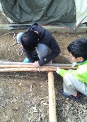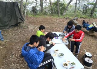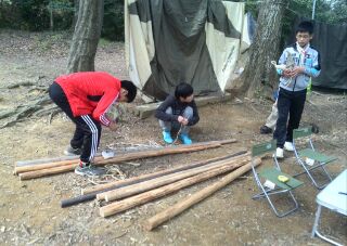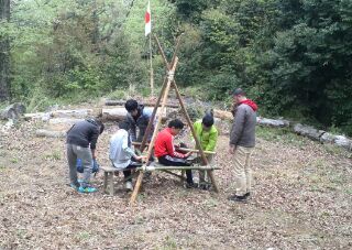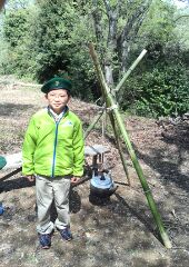 4月の2回目の隊集会はテーマ「おもわぬ敵(七人の敵)」平成27年4月18日(土)本日は、年度初めの「唐沢子供会総会」に出席です。しかし、参加スカウトは1名......。寂しいほとんどのscoutが、部活等で不参加なのです。 しかし、こんなことでめげてはいけない。総会後、BS隊は、野外工作とサイト整備の予定でしたが、さすがに1名ではこれまた、厳しい......。そこで、初級章を取得していなかった、古〇田君のため強化プロジェクトを敢行。まずは、ロープワーク、初級章の課題の5種類の結索のチェック。 ついで、今回は、キャンプなので、テントの設営、簡易カマドの作成に挑戦! そんなことをしているうちに、部活を終えたスカウトたちが、ちらほらやって来た。そこで、本格的な、立カマド作成(今回のキャンプ中に使用するものである)。隊長は、他のリーダーに現場を任せ、食料調達の出かけたのだ。・・・・・・・・・・・・・・・・・・・・・・・・・・・・・・・・・・・・・・・・・・・・・・・・・・・1時間ほどして、隊長が戻ってきてみると、あら不思議、見た目は立派な立ちカマドが出来上がっているではないか。ふしぎだなぁ~。出かけるときは、足組も途中のまでしか組みあがっていなかったのに......。 まあ、いいか。とりあえず、これでキャンプができる。では、夕食の準備開始。 ちょっと、炎がすごすぎない今日のメニューは肉じゃが、ご飯、キノコの味噌汁。 では、いただきます。白いご飯がおいしかったです。肉じゃがもまずまず。味噌汁はしょっぱかったな。片付けの後は、明日の工作物の計画とスカウトソング。隊長は、スカウトソングが苦手だ。学校の音楽の評価は低い。子供のころは音痴で、人前で歌うの苦手だったのを覚えている。楽器は、カスタネットが得意であった。そんな時、RSスカウトの金〇君が、スマホでジャンボリーソングを披露してくれた。23WSJのテーマソング「The Spirit of Unity」を聞きました。お~、しみじみ聞いたのは初めてだった。う~ん、今風。平成27年4月19日(日)本日は、快晴でしたが、お昼から天気が悪くなる予報......。朝食は、お手軽炊き込みご飯とみそ汁、お豆の佃煮。 そのあと、朝礼を行いました。今日は、以前からBS隊長が渇望していました、あの「三脚信号搭(見張り台)」作成に挑戦。 しかし、参加メンバーは、BSスカウト4名。これはかなり厳し、そこで、コンパクト見張り台の作成をすることに決まりました。サポートは、scoutが参加していないのにVS黒〇隊長、最近転職したBS清〇副長です。まずは、三脚作成。ここまででほぼ午前中が終了。 昼食は、ポテト入り焼きそばとわかめスープ、オレンジ。午後になると、空は雨が降りそうな模様作成場所を、野外調理場に移動し、作成続行。上部の逆三脚が結構難しい。隊長も参戦しての作成。解散までのタイムリミットが近づいている。 形が出来上がる、あとは、縄梯子。ちょっと、傾き加減がBS隊の現在の実力を物語っている。しかし、スカウト達はめげそうな気持を奮い立たせて完成させました。 scout達よ、VS隊になったあかつきには、ぜひとも本格的な見張り台を作ってくれたまえ!!!!VS隊のLeaderのお手伝い、ありがとうございました。scout:6名Leader:3名VS隊:2名RV隊:1名