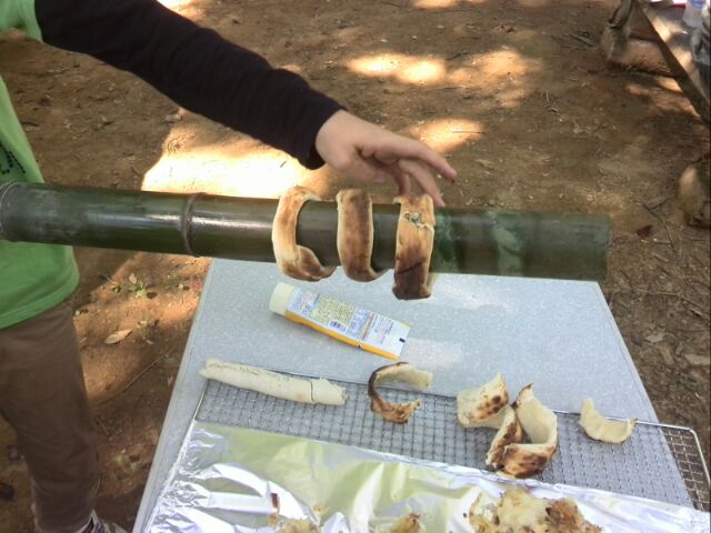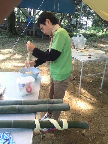 小麦粉とベーキングパウダーを混ぜ混ぜ。塩少々。あとは、竹に巻いて焼くだけ。