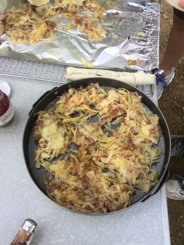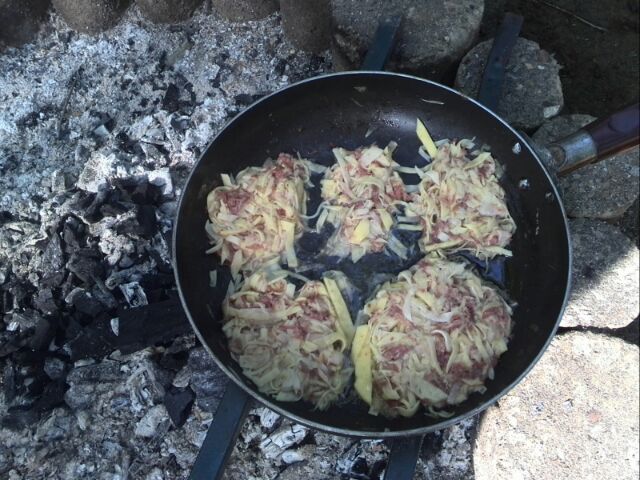 小麦粉コネコネグループとポテト千切りグループに分かれ、調理。