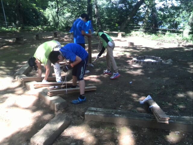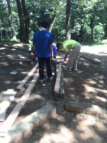 朝礼を済ませると、杉板を利用して、「すのこ」を作ることにしました。杉板を協力してのこぎりで切り束ねます。時間がないので、続きは次回へ。