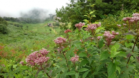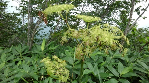 「肩ノ小屋」周辺に来ると、周りはクマザサに覆われ、見晴らしがよくなってくる。ここで昼食タイム。