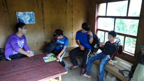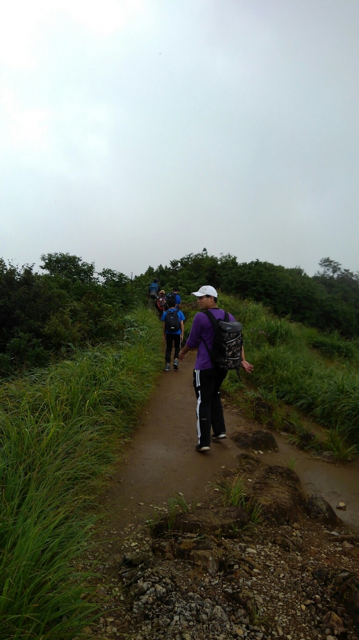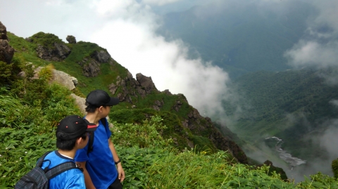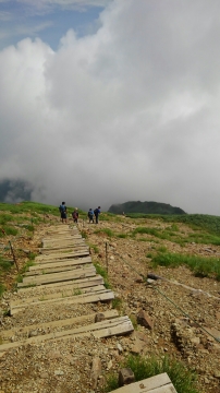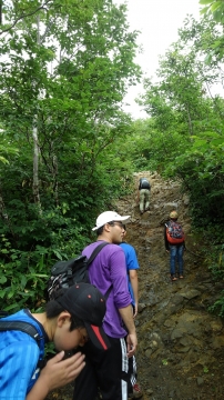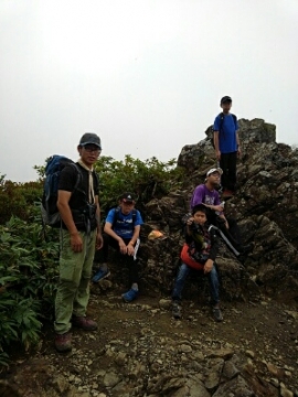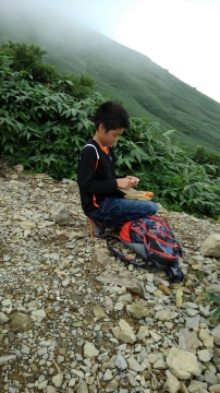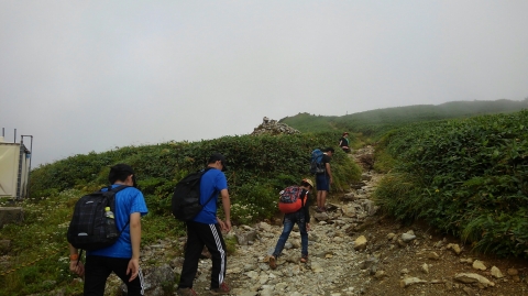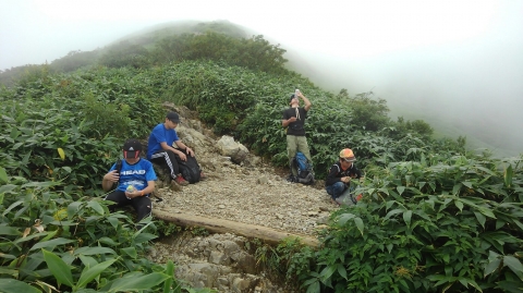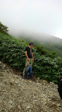 この辺りでトラブル発生。引率リーダーの木〇副長が体調不良。運動不足による軽い高山病かな。息切れがひどいので、ここで下山の指令。