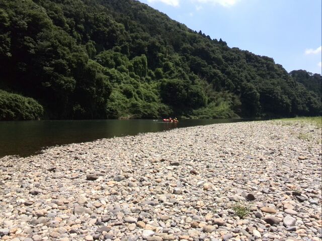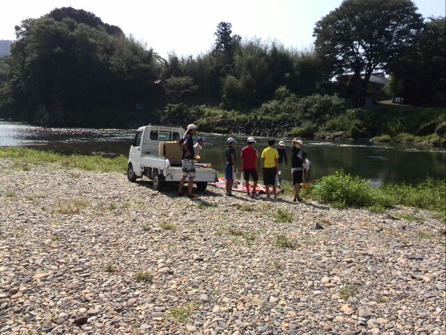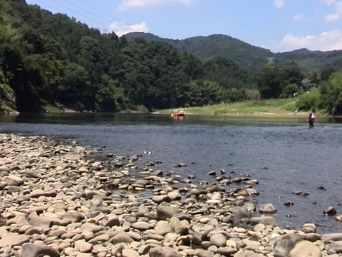 到着ポイントでは、一足先に悠遊会の方が待機。上流には釣り人が鮎釣りをしている。
