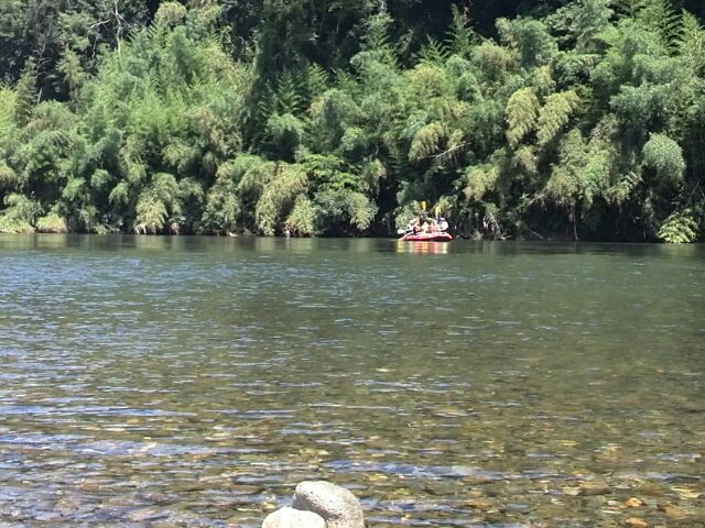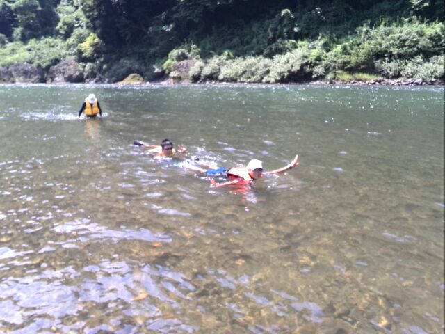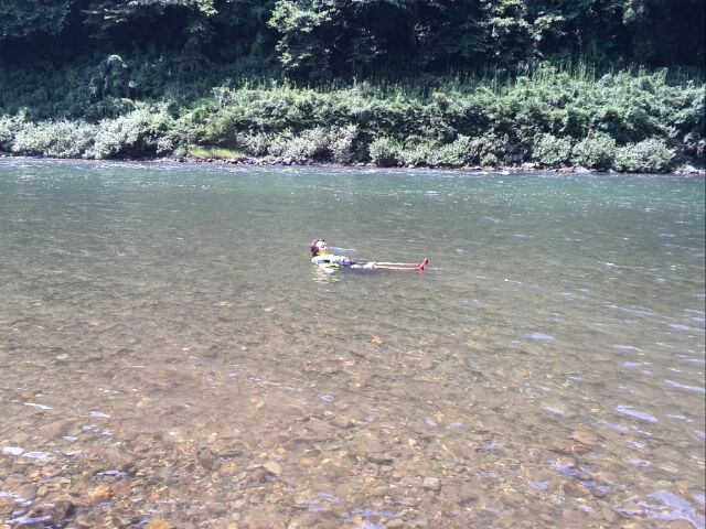 近づいてよく見ると、ほかのメンバーはすべて水の中!!!転落かと思われたが、なんと、ボートの上が暑いので、川に飛び込んで気持ちよく流れてきたとのこと。
