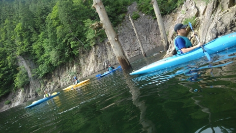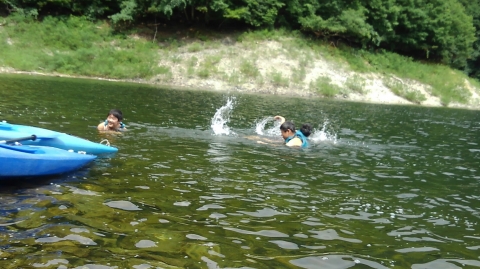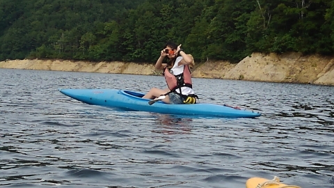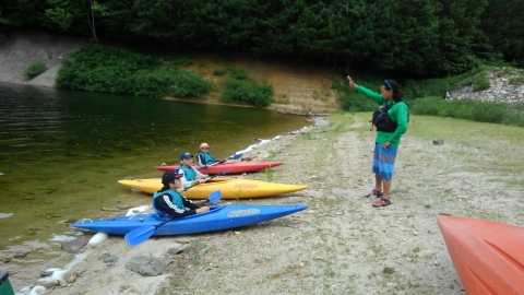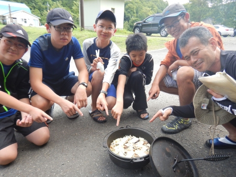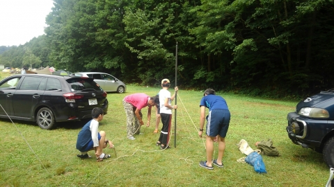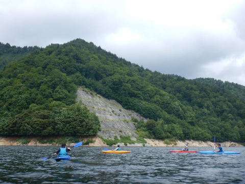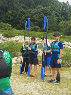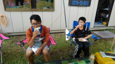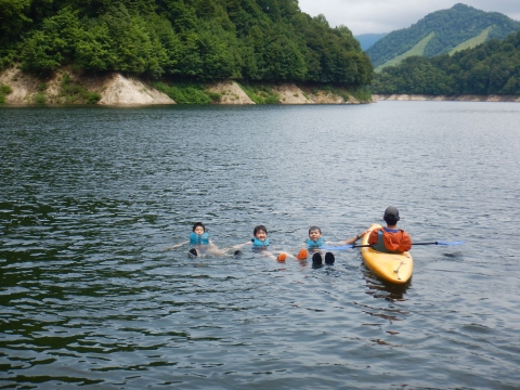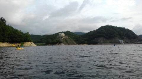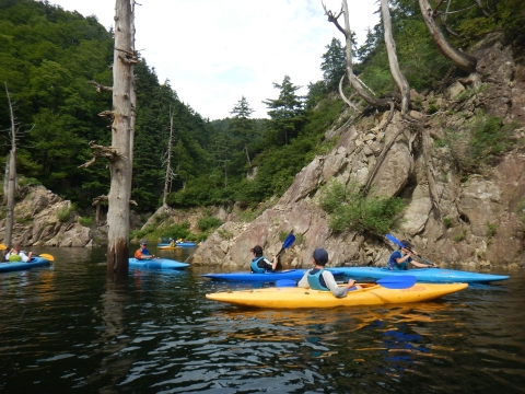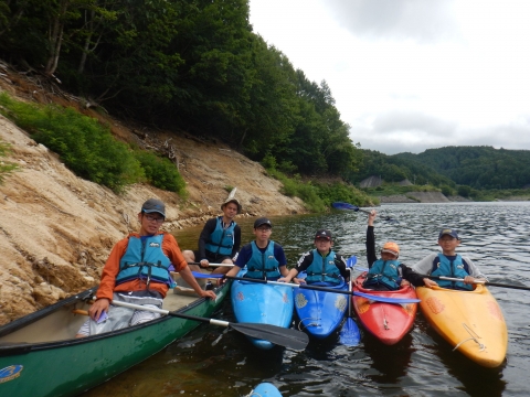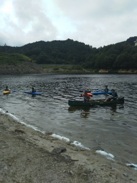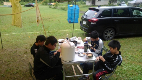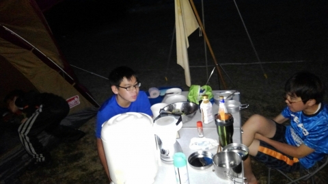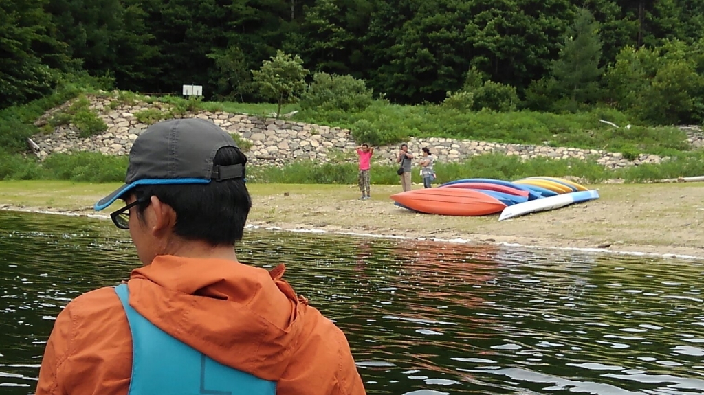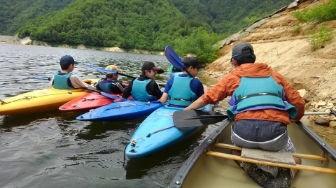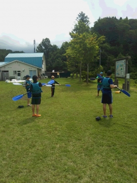 夏季野営2日目です!!!平成29年8月20日(日)天気はまずまず。(隊長は、ほっと安心。何せ、夏季野営の目玉の一つの今日はカヤック体験。天候次第では中止もありうるプログラム) 朝日ががまぶしい一日を迎え、みんな起床の時間だ。 朝ご飯の準備中、巨大なナメクジが...。朝食の準備、食事を済ませ朝礼をすると、カヤック体験の準備。 目玉焼き、サケのホイル焼き 出発前に、時間があったので物干しを作ることになりました。ロープワークを駆使しろ!基本は濡れてもよい服装とウォータシューズ(サンダル)。ただし、ならまた湖の水量が例年よりも多いため、予定のコースがとれないため、ルート変更を依頼して1日コースでカヤック体験です。 まずは、安全第一「ライフジャケットの着用」 そして、パドルの扱い方の練習。ならまた湖の風の様子。そこへ現れたのが、金〇夫婦。陣中見舞いとして保護会と金〇夫婦から飲み物の提供がありました。ありがとうございました。おかげで明日の活動の飲料水が手に入りました。 いざ、乗船。scoutは一人乗りのカヤック。 隊長と副長のペアで、カナディアンカヌーに挑戦。隊長が乗ってみたかった(ラスカルの最終話のようなイメージで)まずは、カヤックの操作の確認。まっすぐに進めるか?曲がりたい方向へ行けるか? 慣れたところで、ならまた湖の奥へ進もう。 変則プログラム。カヤックの基本的な操作方法。湖面は、風があり、漕がないと先に進まないどころか、風下へ。ズンスズン進むと雨はいつの間か、上がって言いましたね。 ダム湖の岸辺に上陸、一休みの後、湖面に飛び込む湖水浴。 日差しは弱かったが、濡れた体を温める日は充分であった。 休憩後、カヤックに乗り一旦スタート地点戻り、昼食。 昼食は、アンクルベアーで準備してくれた、ダッチオーブンで作るピラフ。茄子とチーズが絶妙でしたね。 休憩中、scout達はアイスなど頬張っていました。午後は、他のグループと合同でカヤック体験。リーダーもカヌーからカヤックに乗換。 アンクルベアーのお姉さん今回は、ならまた湖の中間くらいまでの距離を往復しました。滝を見たり、枯れ木の間を通り抜けたり。カヌーなしでは見ることのできな風景でした。 結構のんびりしていたせいか、気づいたらもう4時になるじゃないか。学業のため参加scoutが途中で帰らねばならない時間だ。急いで岸辺に戻り、帰りの電車のに間に合わせるため、着替えて隊長の車で水上駅まで送らなければならないのだ。