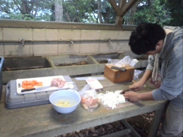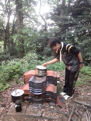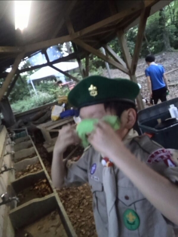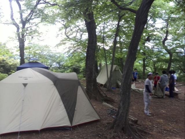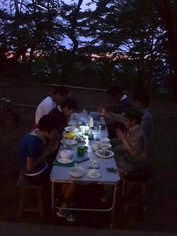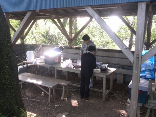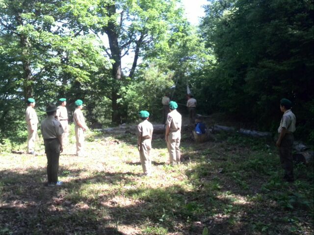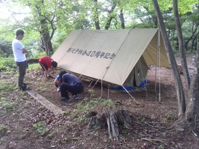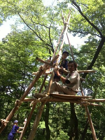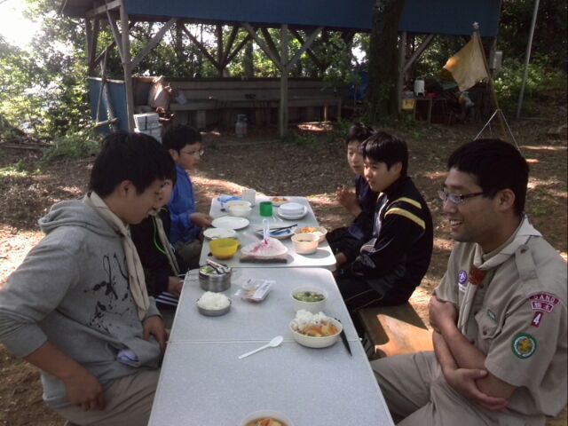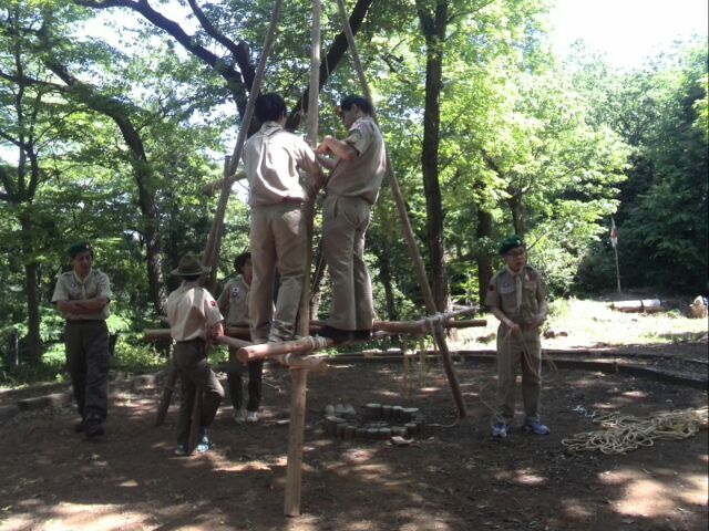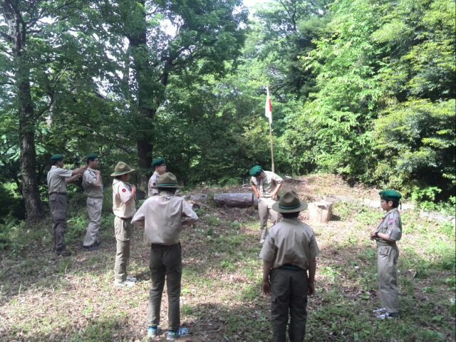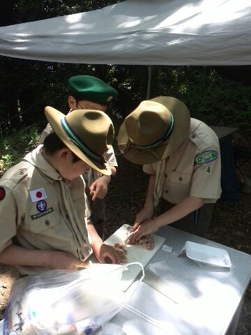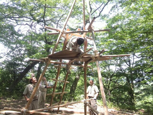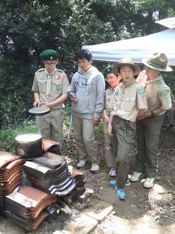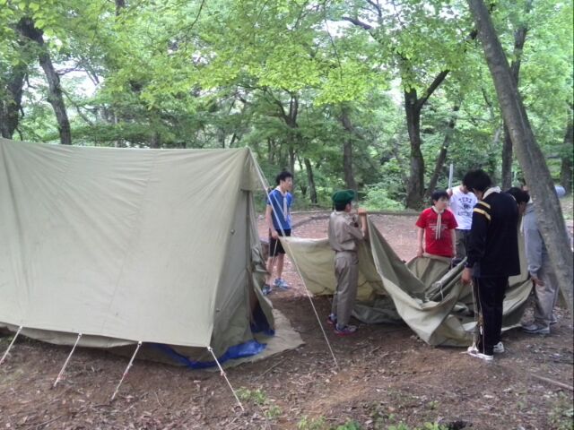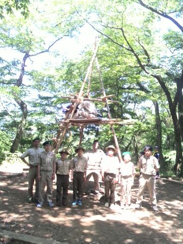 「スカウト体験会」平成28年5月7日(土)今月のテーマは「コロニー」。GW最後の土日、キャンプ日和です。まずは、テントを張るのだ。テントは、ドームテントと家型テントの2種類。スカウトは、いろいろなテントをたてられる技能を持っているといつか役に立つこともあるでしょう。 ドームテントは、流石に時間はそれほどかからなかったが、初トライの家型テントはかなりの時間を要した。 唐沢子供会のおさがりテント。そして、今回、隊長は仕事のため遅刻しました。そして、何とか明るいうちに出来上がったテントを見て、隊長が一言。「今日はこのテント(家型テント)に寝てもらいます。」「ドームテントは、荷物置き場にしてください。」 玉ねぎにやられた。そして夕食の時間。メニューは3月の約束第2弾の「シチュー」です。ご飯も炊きます。野菜を切る担当、薪を集めて火を起こす担当。薪は明日の分まで集めておけよ。 使うは「瓦のロケットストーブ」だんだん使い方のコツがわかってきたぜ!! 夕食完成。ご飯は、ガスで炊きました。今回のご飯は95点。 夕食を片付けた後、明日のスカウト体験会の準備です。金の丸ロッヂから丸太を運びます。一番太くて長い丸太はleaderが運びましたが、そのほかの丸太はscout達が協力して運びました。 三脚を作り、その上に人が登れる展望台を作る予定です。まずは、三脚を組み立てるところから。「Figure of eight lashing (8の字縛り)」「Square lashing (角縛り)」の練習がたくさんできるぞ。 そして、暗闇の中、懐中電灯を駆使し、就寝時間ぎりぎりに三脚が完成。暗くて、写真が撮れん.........。では、これにて今日の活動はおしまい。平成28年5月8日(日)おはようございます。scout達は、きちんと朝寝坊しました。朝起きると、まずは朝食の準備。朝食のメニューは、約束第3弾の「肉じゃが」です。ほんとscout達のセンスを疑うよ?!切っている材料が3食続けてほぼ同じ。ちゃっちゃとご飯を済ませて昨日の続き。ご飯は、ガスで炊きました。ご飯の点数は、少し焦げたので、75点でした。火加減かな。 こげごはん、味噌汁、肉じゃがの図 朝礼を済ませると、「スカウト体験会」の準備。BS隊の体験は、のこぎりで丸太切りと三脚の展望台です。 朝礼に制服を着てるものが多い。当たり前か。三脚の組み立ては、途中からLeaderを中心に作業し、scout達は安全(?)に登るための梯子を作りました。 三脚展望台が先か?梯子の完成が先か?梯子が最後でした。チャンチャン 完成の図体験会がはじまり、まずは丸太切り体験。のこぎりを握る幼子たち。のこぎりを動かしても、切れてません。あとは、中〇副長が全部切ってました。お疲れ様です。 完成した、三脚展望台も体験会に来た子供たちカブスカウトたちは必死になって登ってました。改良の余地はたくさんあります。 保護者会がカレーを作っている絵お昼は、保護者会が作ったカレーです。体験会に参加した方々にカレーライスの提供。scout達は主食だけ準備し、カレーをもらうシステム。 BS隊の昼食のメニューは、「カレーうどん」です。とりえず、うどんを茹でろ。 腹がへって、うどんを待つscout達昼食後は、体験会終了。速攻撤収です。三脚の解体とテントをたたむのさ。 その間に、隊長たちは団総会。予算・決算の議案。各隊の年間活動報告。 団総会の様子。団総会が終わるころには、BS隊の片付けも大詰め。お~、早い!!! 閉会式をして、無事解散。scout:6名Leader:4名