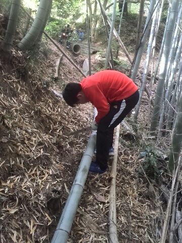 歩くこと10分ほど。団委員長宅の隣の孟宗竹を2本切り出すことにします。