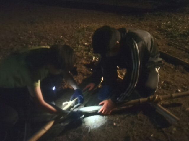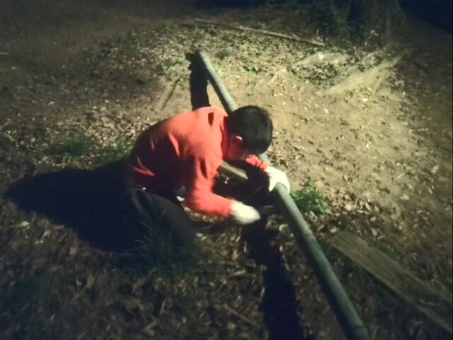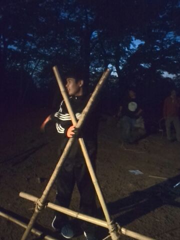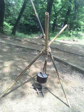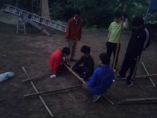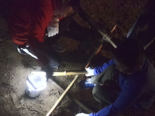 無事竹伐りが終わると、明日の準備、立ちカマド作り。スカウトハウスから荒縄と工具箱。組み立てるために使う竹は、今回の切った