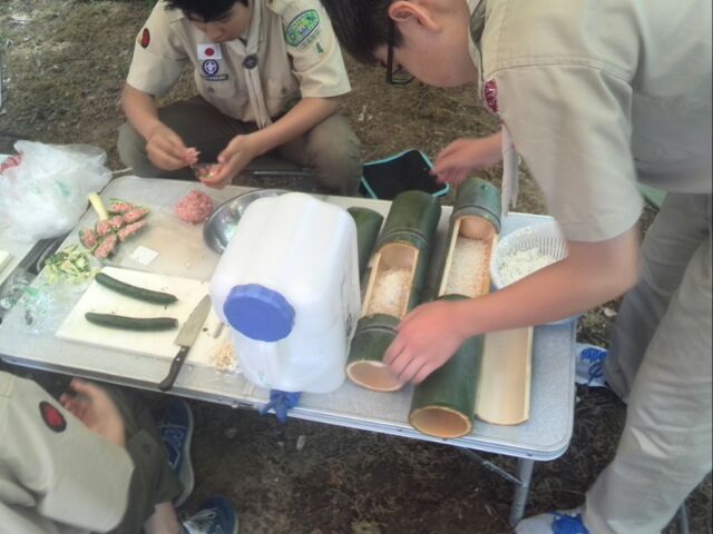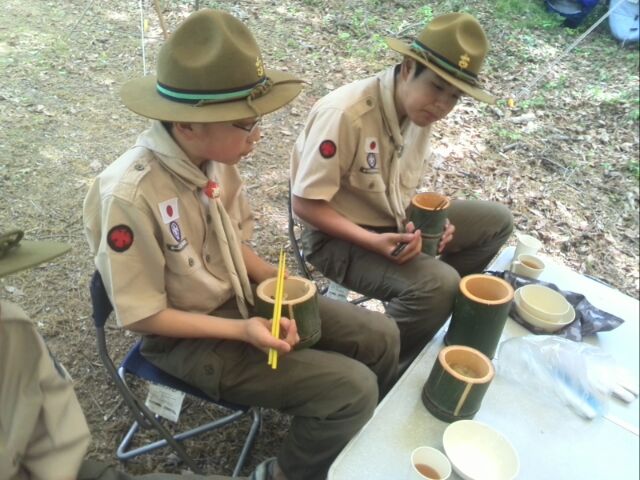 ナタとのこぎりを使って、キコキコ、コンコン......。米を持ってこなかったスカウトが1名(忘れ物は、準備ができていない証拠)。