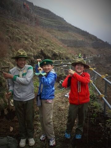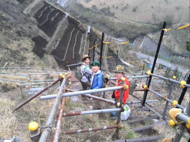 気がつけば、多くの人達は植樹を終え、下山していたのだ。佐野4団(4人)も最後尾に近い状態で急な階段を下りるのだ。上りより危険なのね。