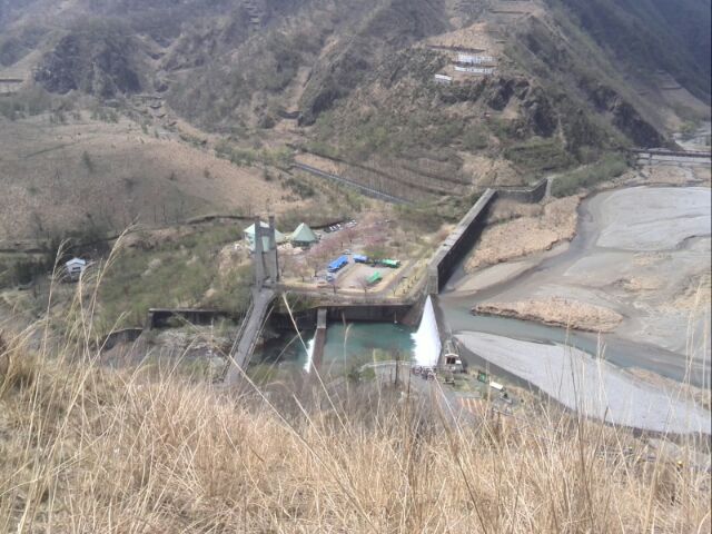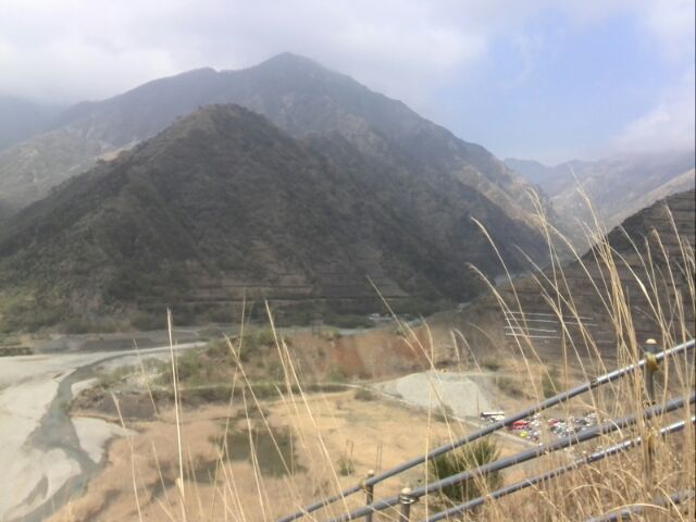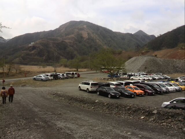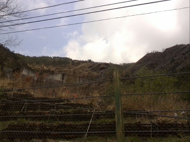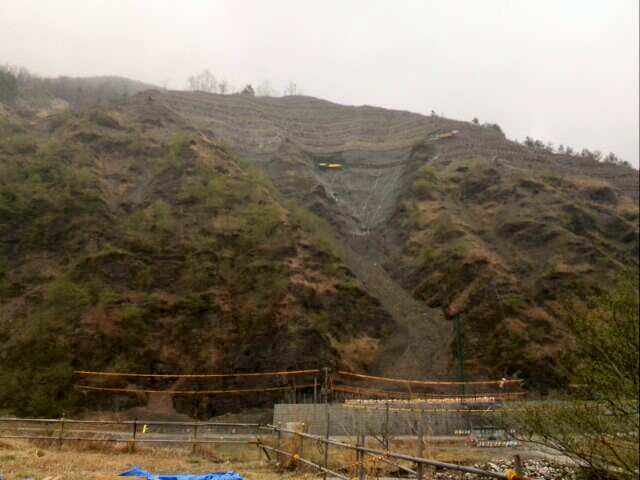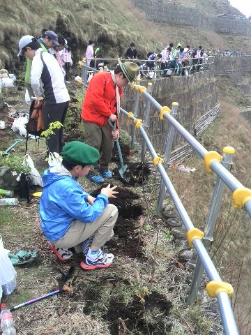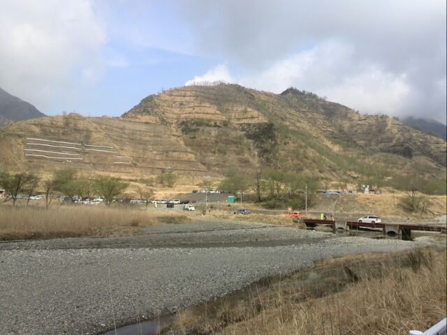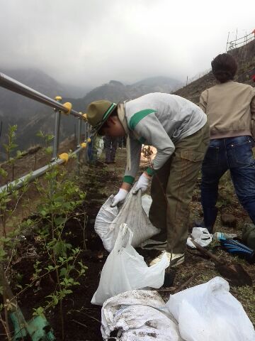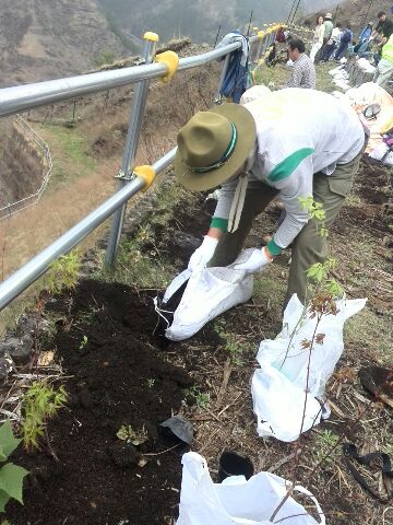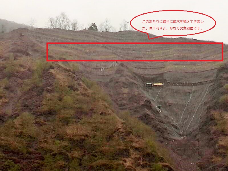 車がトミカのように見える...。途中で、小型シャベルとさらに追加の苗木数本を渡されて進むこと数百メートルは行き止まり。行き止まりのポイントは、かなりの急斜面をにかなりのお金をかけて作っとと思われる土留めのエリアであった。