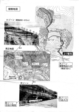 植樹場所Aゾーン「戸四郎沢」は800段の階段があると話題になっていました。Bゾーン「アカン沢」は、道路からすぐの場所で比較的なだらかな場所。